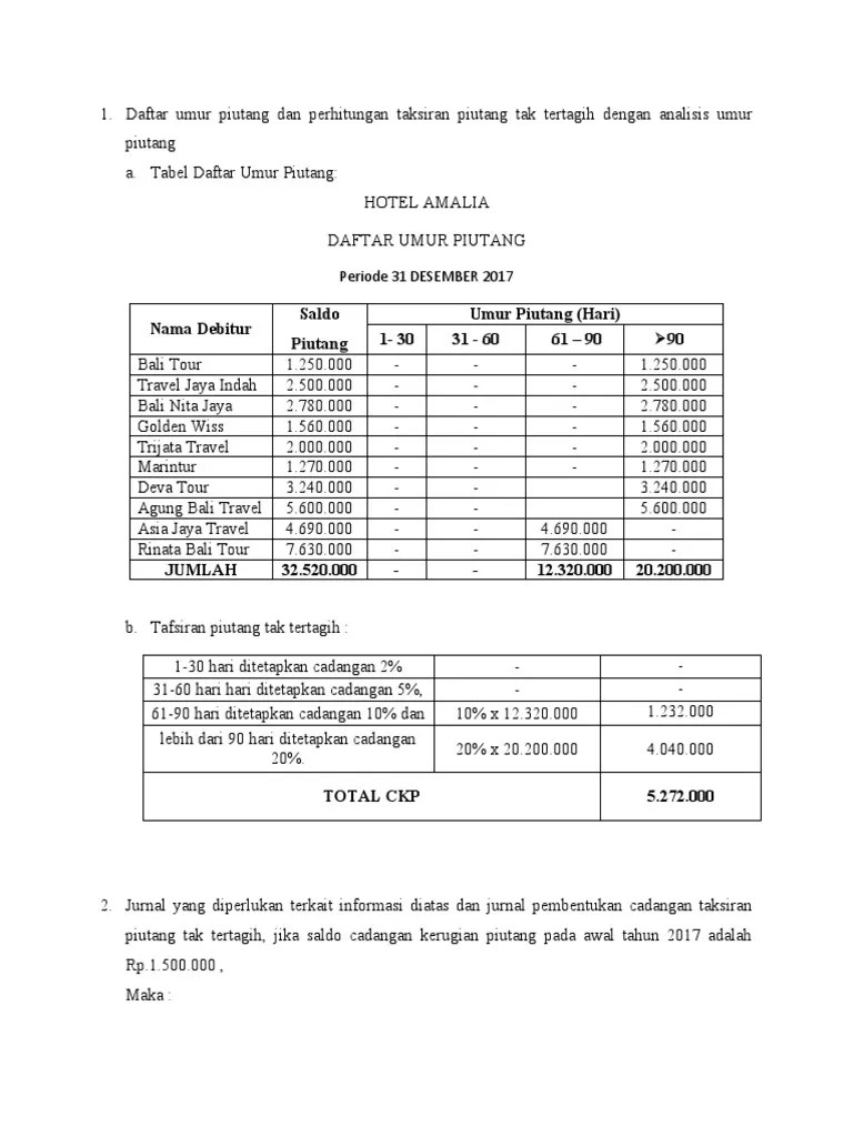 With this analysis, it is hoped that it can. Penjualan kredit, piutang tak tertagih. Penelitian ini bertujuan untuk mengetahui apakah pencatatan dan pelaporan piutang tak tertagih berdasarkan umur piutang di perusahaan perum perumna. Tertagih berdasarkan umur piutang pada hotel berbintang di manado. Analisis piutang tak tertagih berdasarkan umur piutang pada pt.